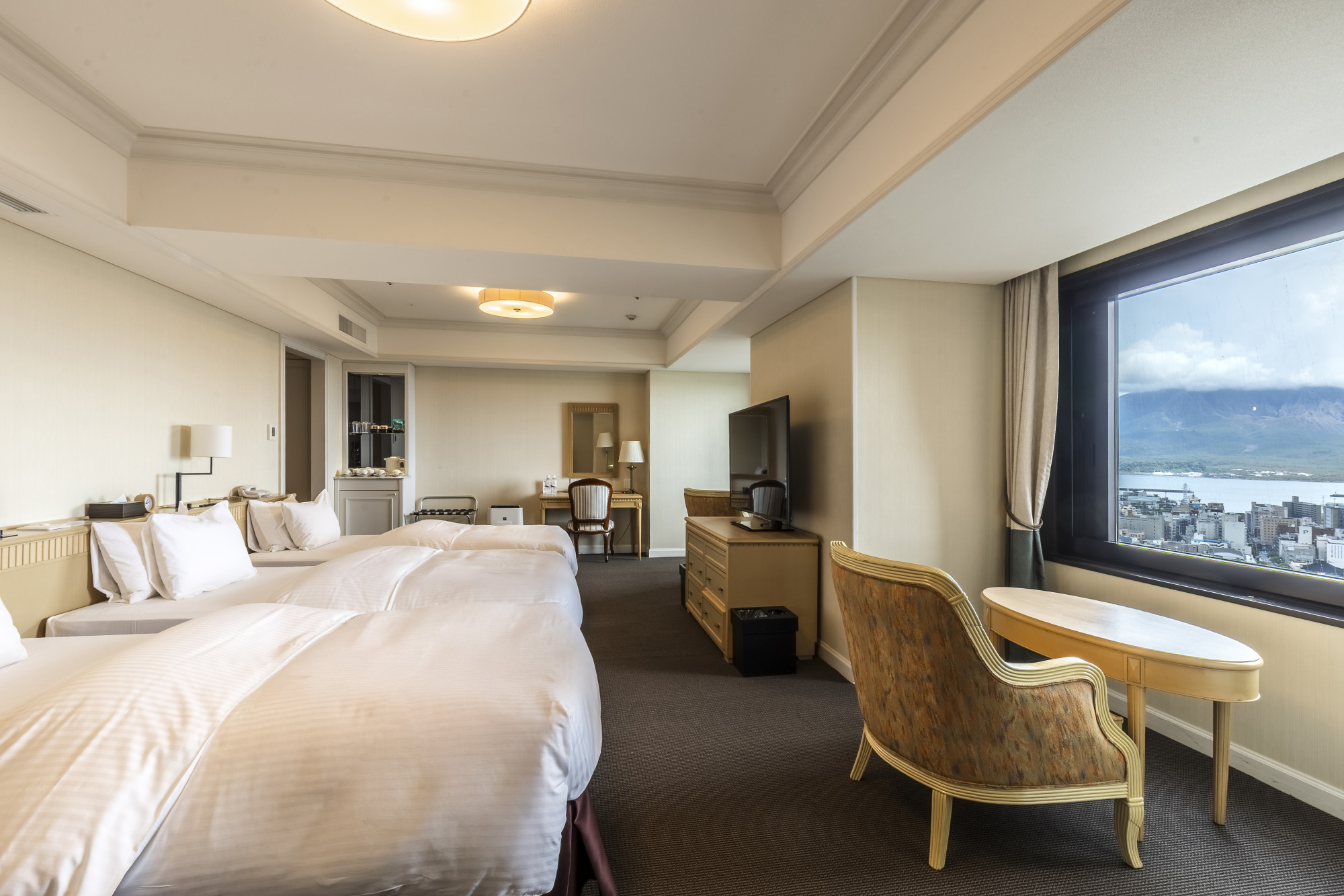客室内にはテレビや洗面台を2箇所に配置し、2世代3世代で楽しめる快適なホテルライフをご提供いたします。 カーペットやカーテンなど部分リニューアルし、広くなった窓から眺望を楽しみながら家族で旅の語らいなど思い出に残る時間をお過ごしください。