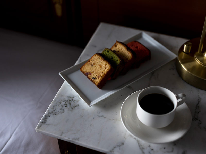 チェックインされた後は、お部屋で雄大な景色を眺めながら、ゆったりとティータイムをお楽しみいただけるようホテルパティシエ監修のウエルカムスィーツをご用意。ほどよい甘さとしっとりとした食感が自慢のオリジナルスイーツをお召し上がりいただけます。