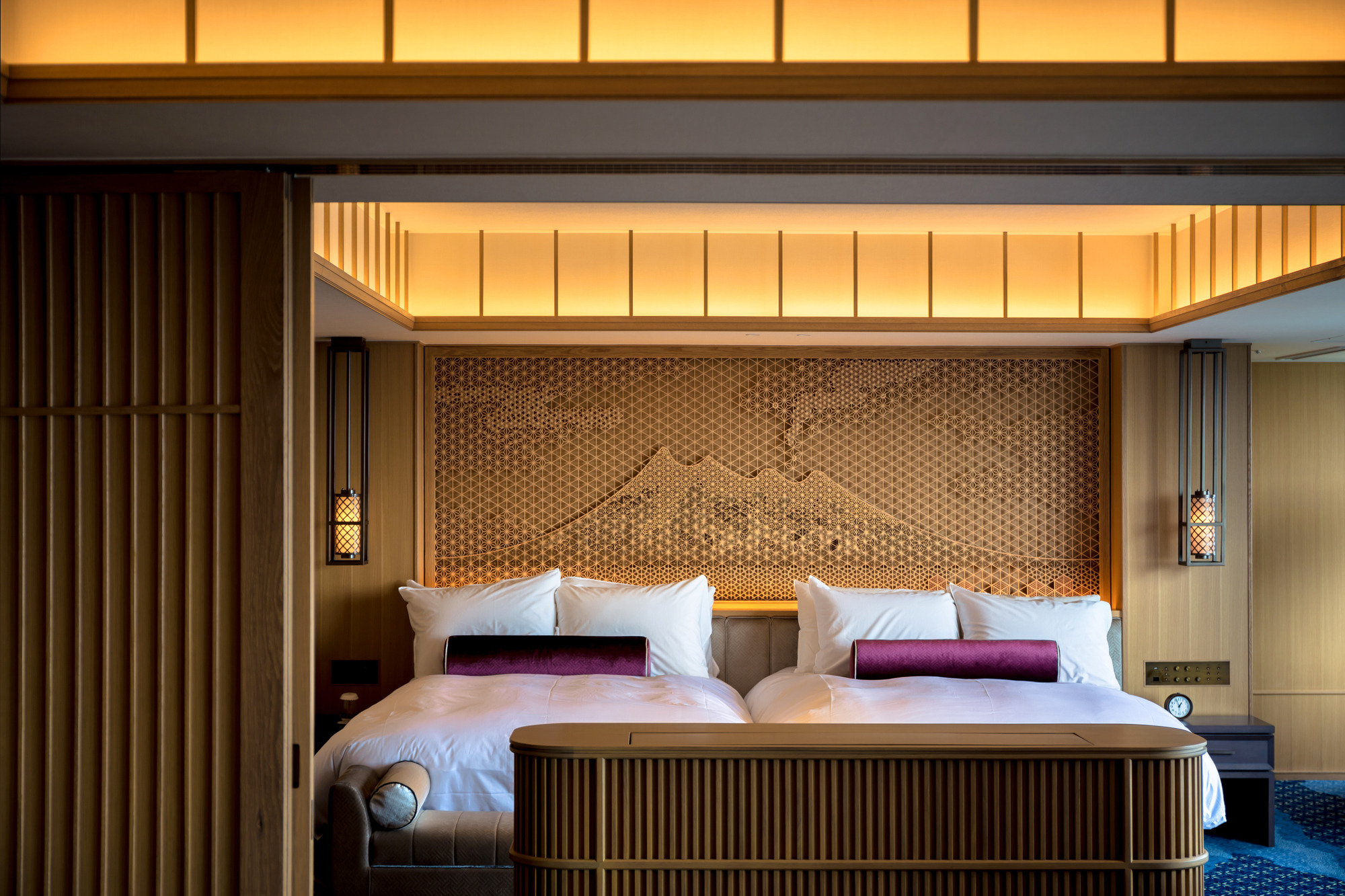リビング・ダイニング・ベッドルームは、それぞれの心地よいプライベート感を保ちながら、 一体の広々とした空間として繋がります。切子柄文様に自然のグラデーションを投影したブロンズのパーティションや間接照明でモダンに仕立てた木格子が 各部屋を緩やかに間仕切ります。ベッドルームでは、鹿児島の雄大な自然を表現した伝統工芸の組子がお客様をお迎えします。