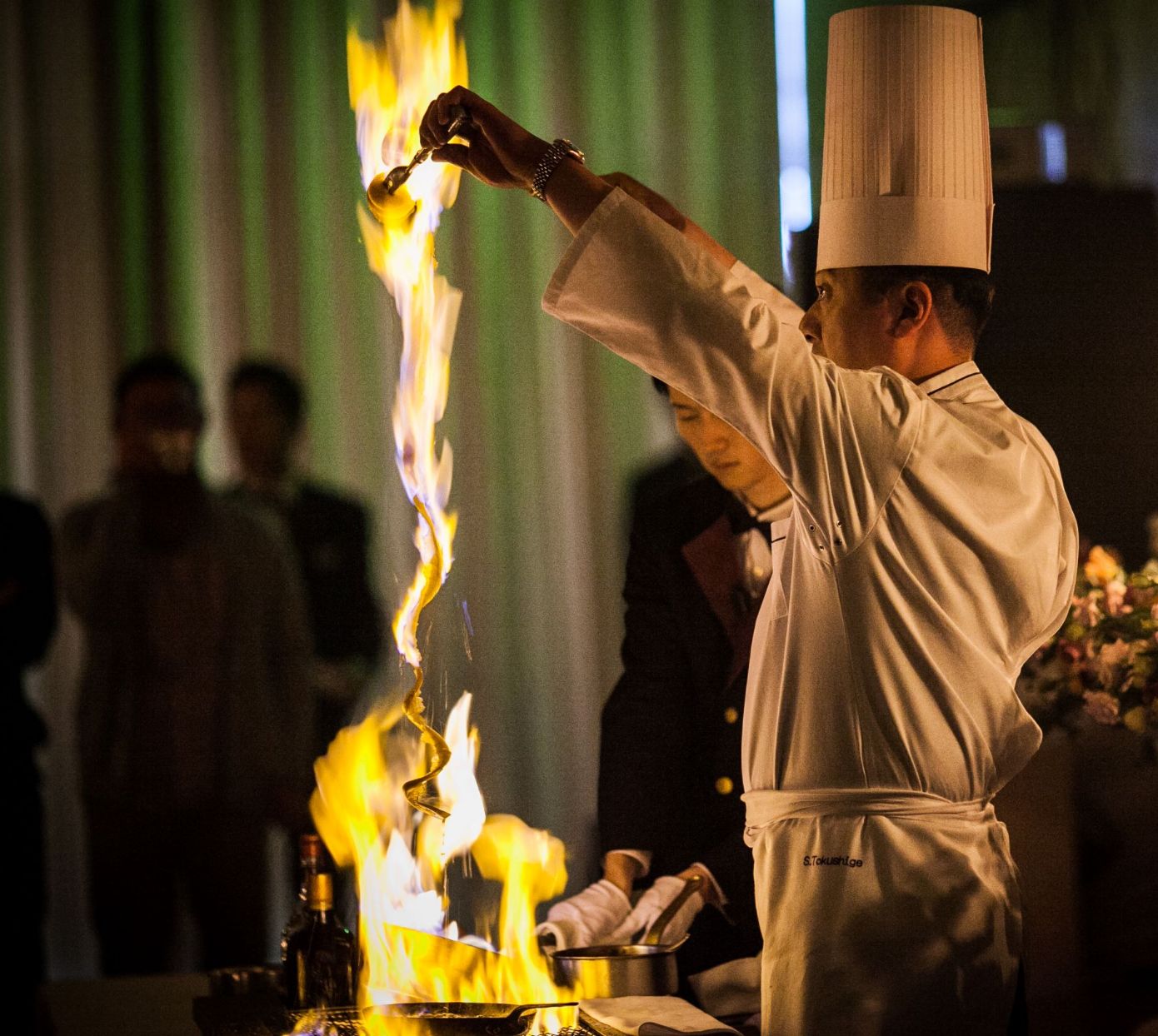 ホテル伝統の炎の演出が祝宴を盛り上げる。